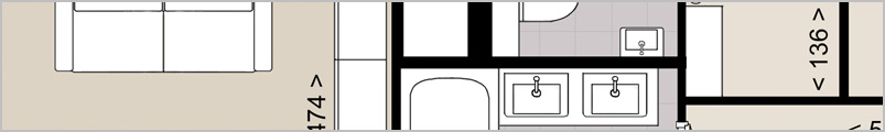 De schematische variant maakt gebruik van enkele soorten witgekleurde meubels die, samen met het kleurgebruik van de ondergrond, aangeven welke functie de ruimte heeft.
